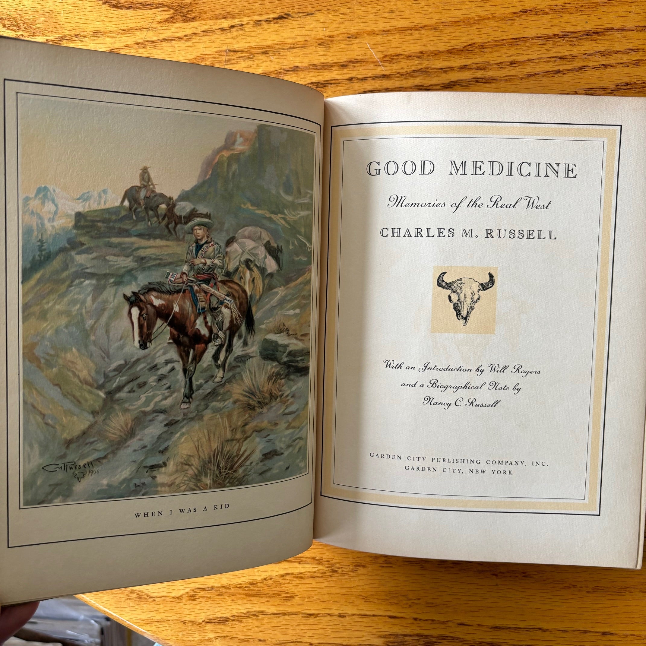 Charles M. Russell, ‘Good Medicine: Memories of the Real West,’ Garden City, 1930. Introduction by Will Rogers. Biographical note by Nancy C. Russell. No edition stated–presumed first.
