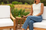 Outdoor heated 2-chair set with built-in heating for two chairs. Sustainably sourced teak frames with plush performance cushions. Multiple heat settings. Creates a warm and inviting outdoor seating area.