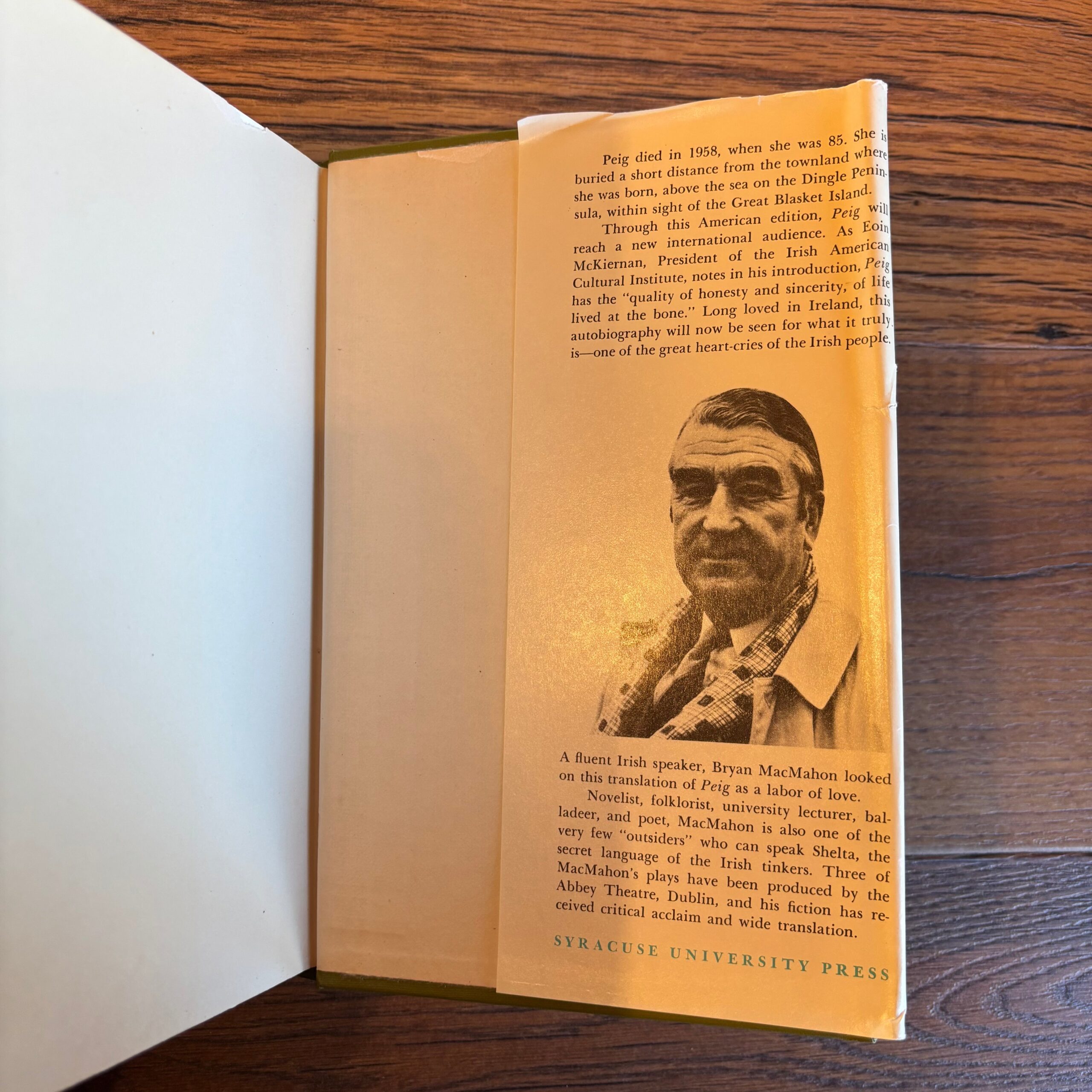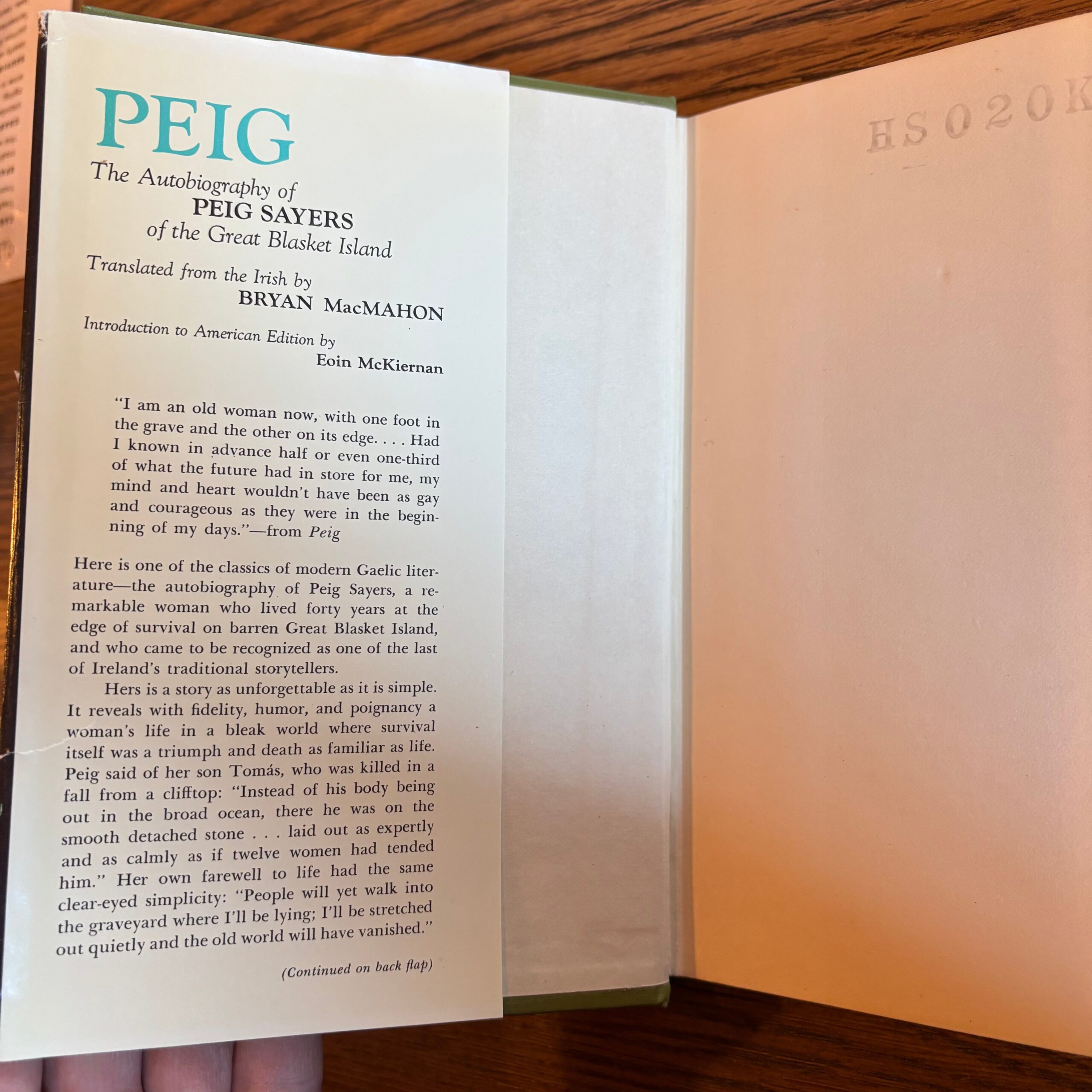 Peig Sayers, ‘Peig: The Autobiography of Peig Sayers of the Great Blasket Island,’ Syracuse University Press, 1974. Translated by Brian MacMahon. Introduction by Eoin McKiernan. No edition stated—presumed first thus.