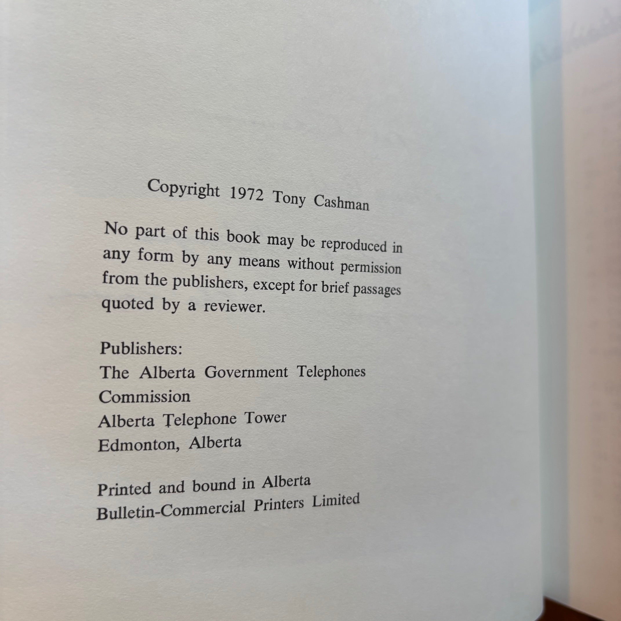 Tony Cashman, ‘Singing Wires: The Telephone in Alberta,’ Alberta Government Telephones Commission, 1972. No edition stated—presumed first.